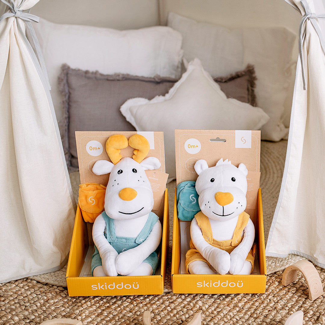 Renul de plus este mascota firmei producatoare Skiddou si a fost creata pentru a oferi zambete celor mici . Caracteristici: - a juta la dezvoltarea abilitatilor de contact, compasiune si empatie. - vine cu salopeta de schimb . Renul are o salopeta galbena cu pantaloni si buzunar din catifea iar cea de schimb este turcoaz din plus - labutele au inchidere cu velco - puteti agata jucaria oriunde - de patut, carut etc. - vine ambalat intr-o cutie perfecta pentru a fi facuta cadou - produsul este conform cu standardul EN 71-1/2/3. Potrivit din prima zi de viata! Dimensiune: 38x18x12 cm