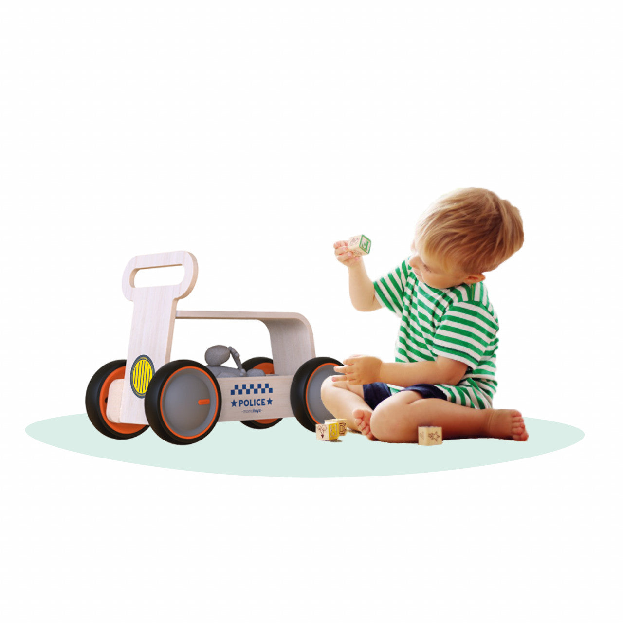 Masinuta ride-on, premergator si carucior de jucarii MamaToyz DriveMe Wood, Politie - Jucarie din lemn 3 in 1
