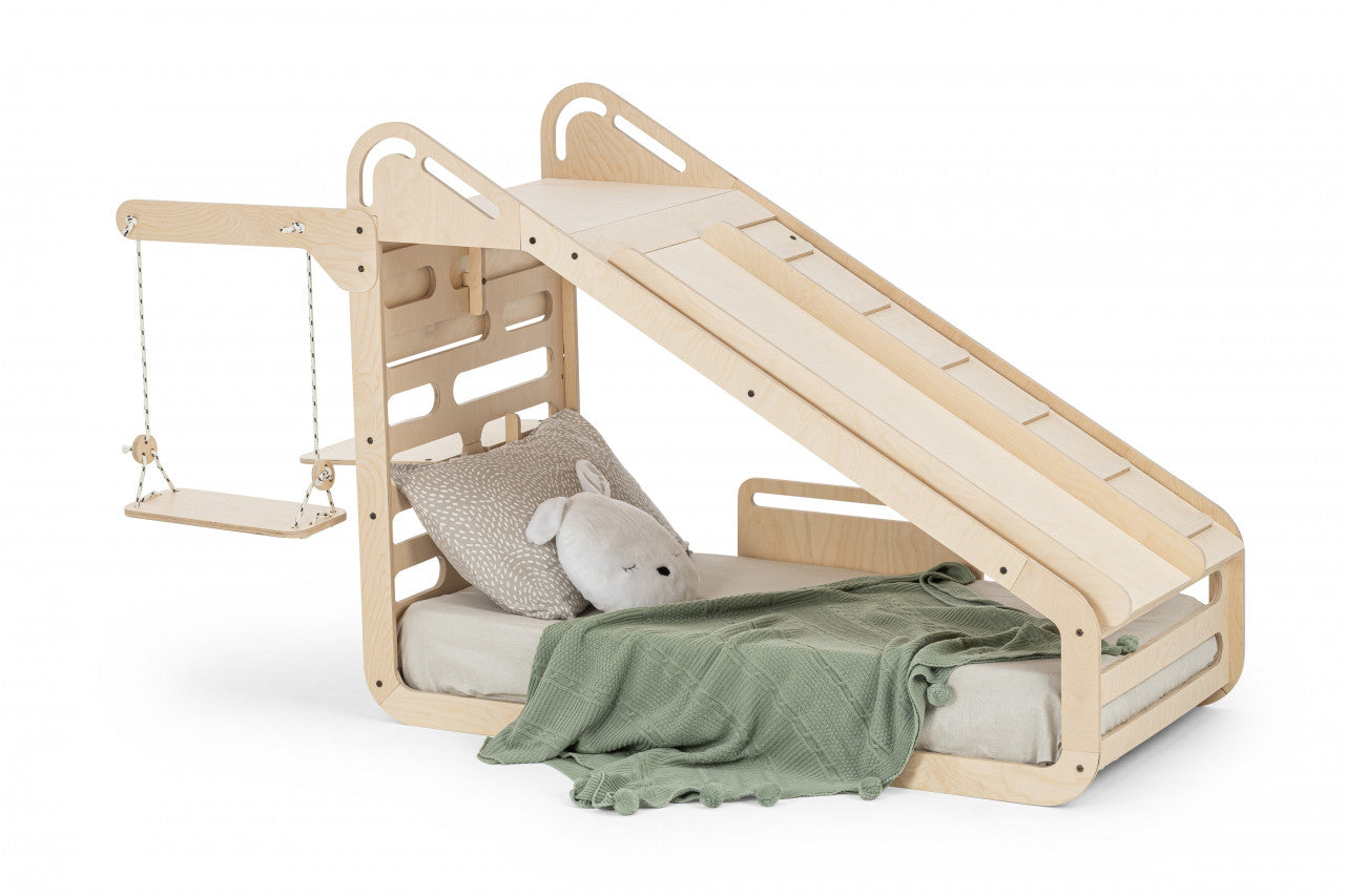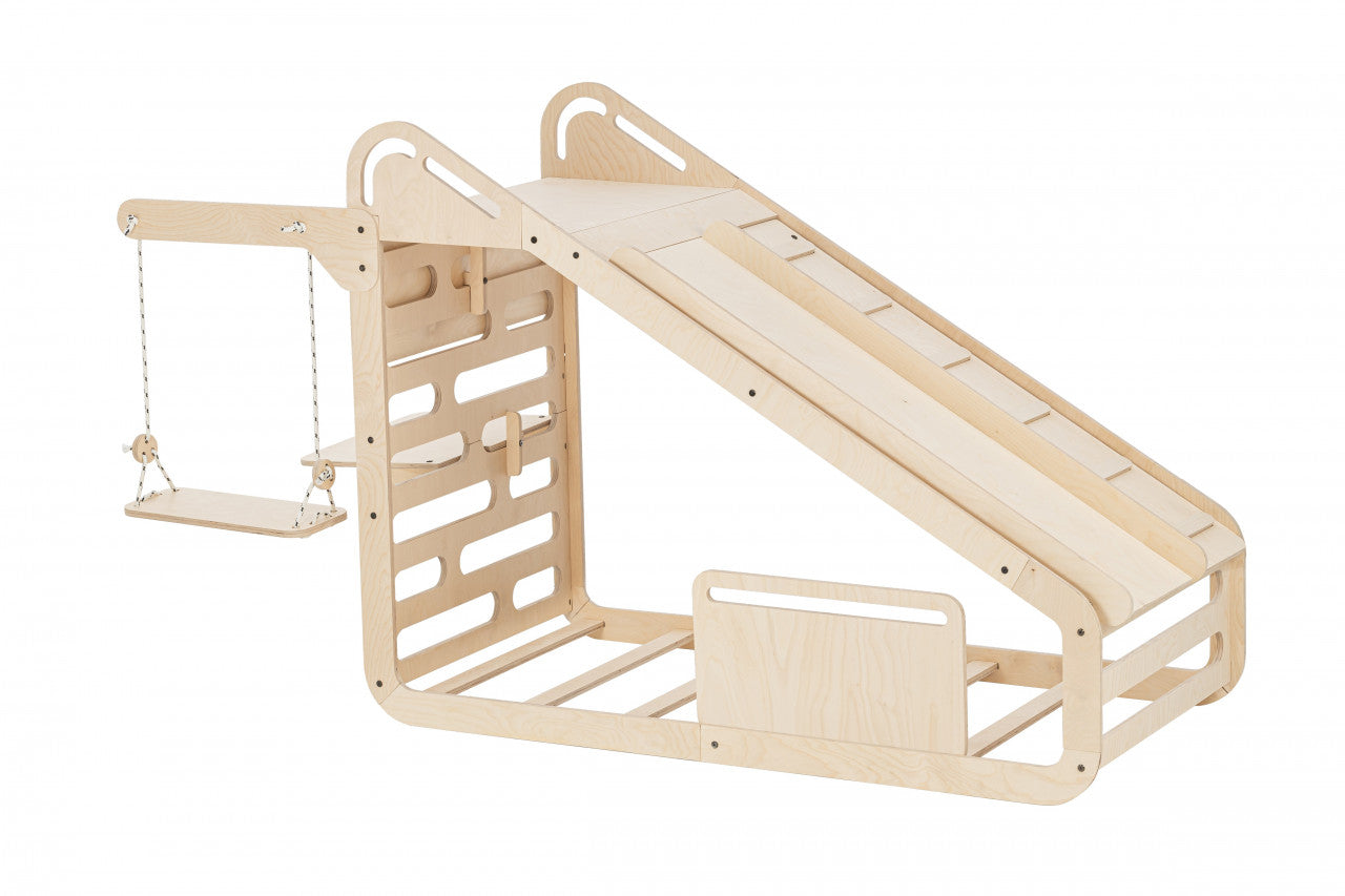 Pat Montessori din lemn MamaToyz, cu tobogan, tabla de scris, masuta si leagan, Natur