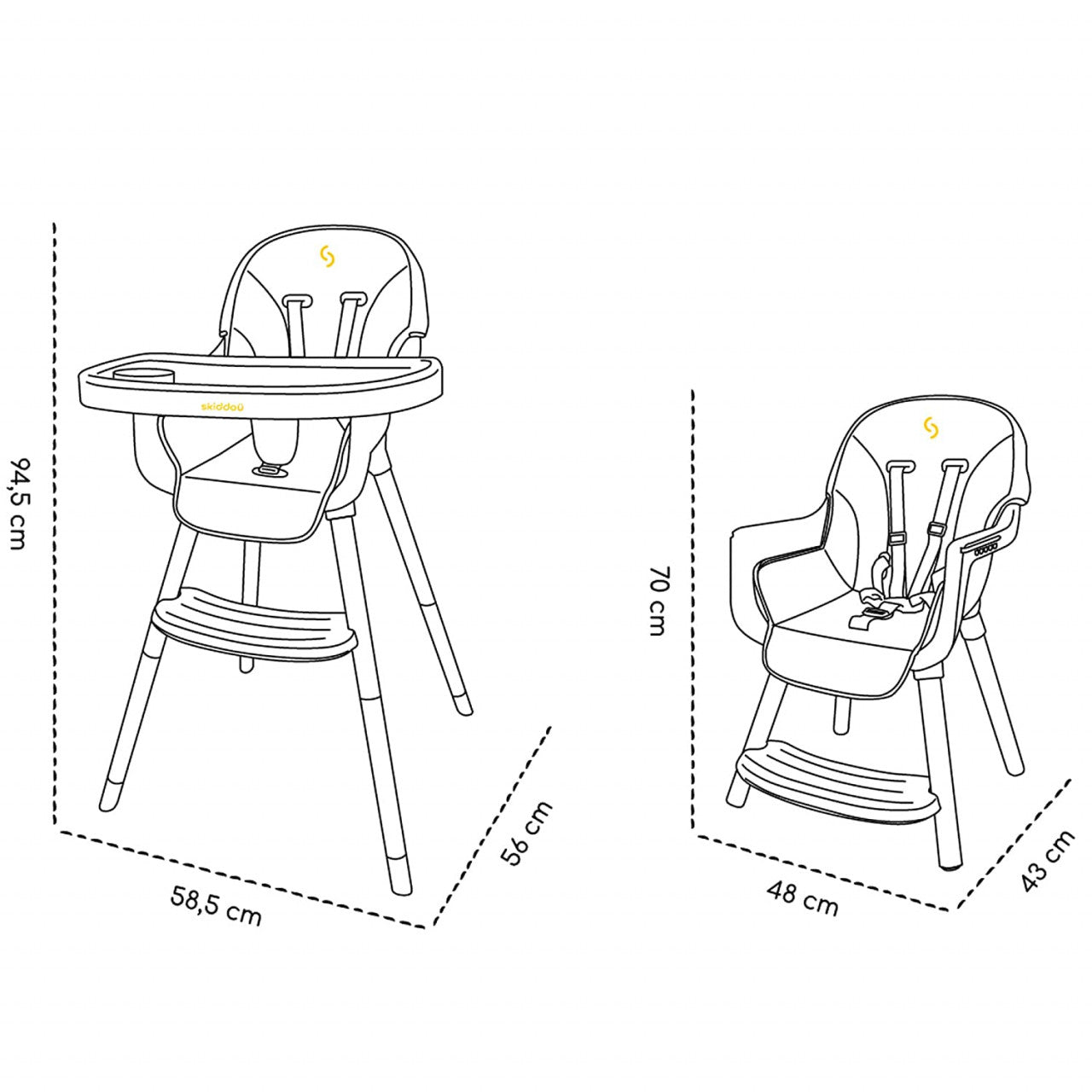 Scaun de masa 2 in 1 transformabil Sunt de la Skiddou este un scaun ce creste odata cu copilul! Acesta este mai intai un scaun de hranire pentru copii incepand cu varsta de 6 luni ca mai apoi sa se poata transforma in versiunea mai joasa conceputa pentru copiii mai mari. Caracteristici: - scaun 2 in 1 : scaun de masa inalt pentru bebelusi de la 6 luni pana la 3 ani sai 15 kg, ca mai apoi sa se poata transforma intr-un scaun jos pentru copiii de pana la 5 ani. - Tava cu compartimente ce se poate scoate pentru a putea fi spalata avand 3 pozitii - Suport pentru picioare ce poate fi scos - Spatar inalt - nu este doar un element estetic sau de confort - este o modalitate de a ajuta la cresterea armonioasa a coloanei vertebrale - Sistem de siguranta cu centuri cu prindere in 5 puncte - Materiale de calitate : este fabricat din piele ecologica , tapiteria este lavabila facilitand mentinerea curata a mobilierului iar designul scandinav face ca modelul Sunt sa se incadreze perfect in stilul oricarui interior modern. De asemenea, are picioare rezistente din lemn de fag care asigura stabilitate si siguranta. - Protectiile speciale de pe picioare asigura stabilitatea produsului si protejeaza suportul impotriva zgarieturilor. - Asamblarea intuitiva a mobilierului necesita putin timp si va permite sa schimbati inaltimea scaunului fara instrumente suplimentare. - conform normelor europene de siguranta EN 71-2 si EN 71-3 Dimensiuni scaun inalt: 58.5x56x94.5 cm Dimensiuni scaun jos: 48x43x70 cm Greutatea maxima recomandata: 20 kg Greutate produs: 5 kg