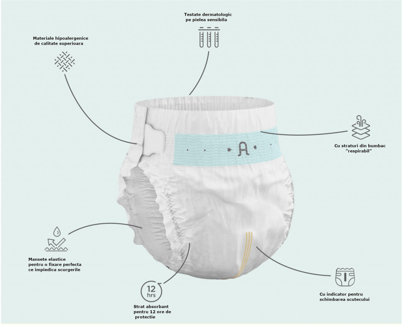 Scutece Supreme Agnotis ofera bebeluslui tau c onfort maxim și protecție optimă fiind special concepute pentru pielea sensibilă a acestora. Caracteristici: - scutecele sunt facute din cele mai pure materiale – nu conțin parfumuri și coloranți – stratul din mijloc nu conține înălbitor iar stratul exterior este din bumbac respirabil. - pentru nopti relaxante – datorită miezului extrem de absorbant care rezinta până la 12 ore, fara a avea motive de ingrijorare cu privire la scurgerile nedorite sau la pielea umeda a bebelusului – astfel încât tu și copilul tău să dormi bine și relaxat. - protecție perfectă împotriva scurgerilor – datorită manșetelor laterale elastice, scutecele de unică folosință se adaptează corpului bebelușului dumneavoastră – aripioarele de prindere nu conțin latex. - schimbarea scutecului la momentul potrivit – indicatorul nostru de umiditate detectează înaintea bebelușului când trebuie schimbat scutecul de unică folosință și își schimbă culoarea dungii. - cea mai bună protecție : scutecele noastre 1 au fost certificate de institute independente. Sunt prietenoase cu pielea, nu conțin substanțe chimice nocive și reduc la minimum riscul de alergie H Y P O A L L E R G E N I C H I G H Q U A L I T Y High quality hypoallergenic materials In structiuni de utilizare: Se fixează cu ajutorul aripioarelor laterale delicate si flexibile, care lasă pielea să respire. Continut pachet: 44 bucati