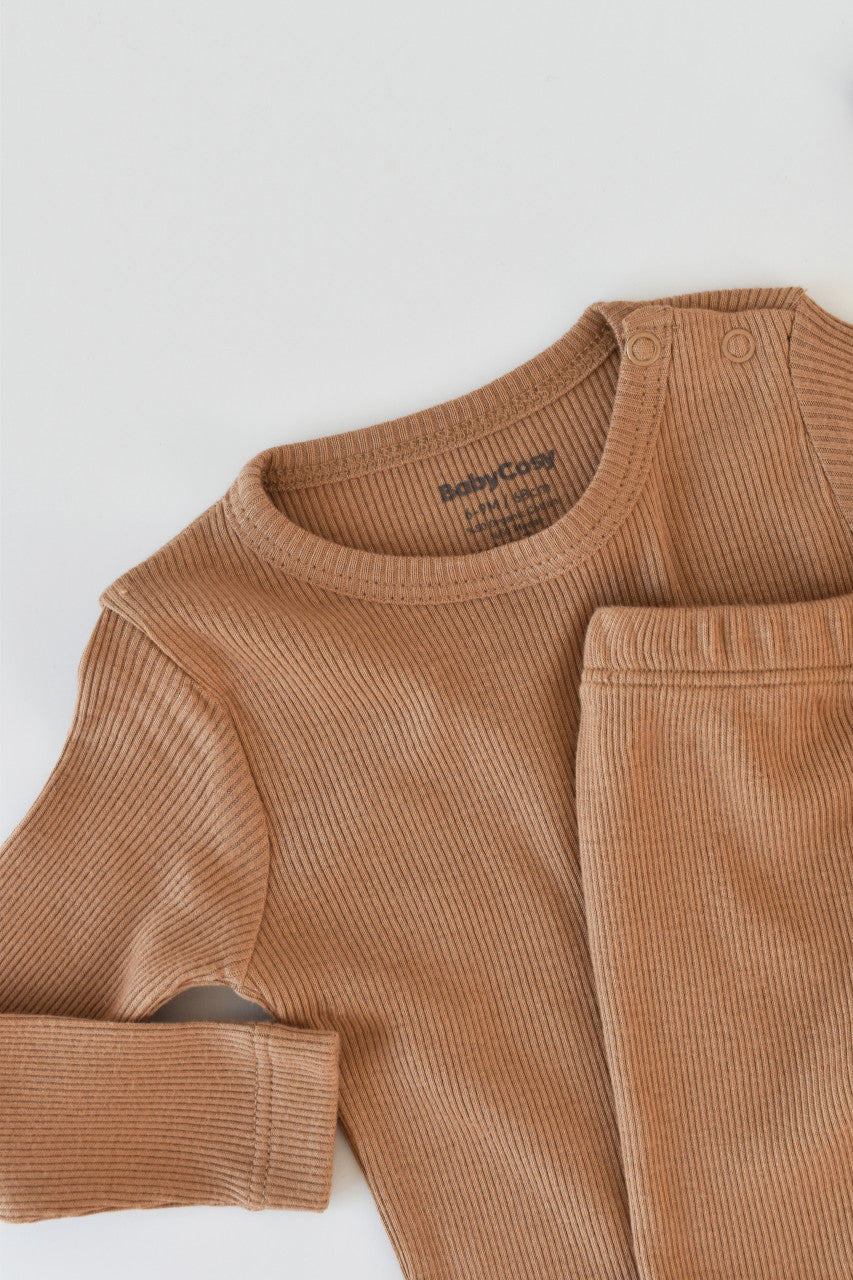 Set 3 piese: bluzita cu maneca lunga, pantaloni lungi si caciulita din bumbac organic si modal - Maro, BabyCosy