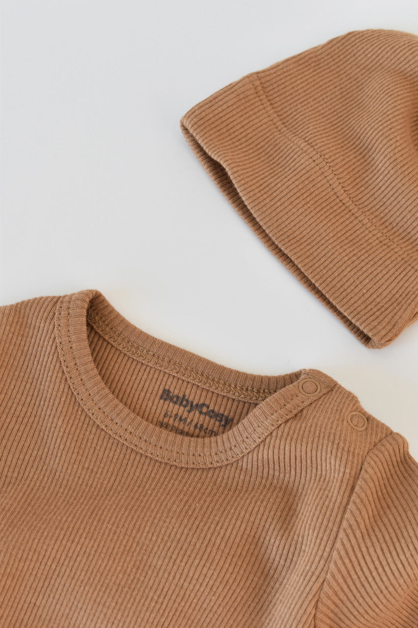 Set 3 piese: body cu maneca lunga, pantaloni lungi si caciulita din bumbac organic si modal - Maro BabyCosy