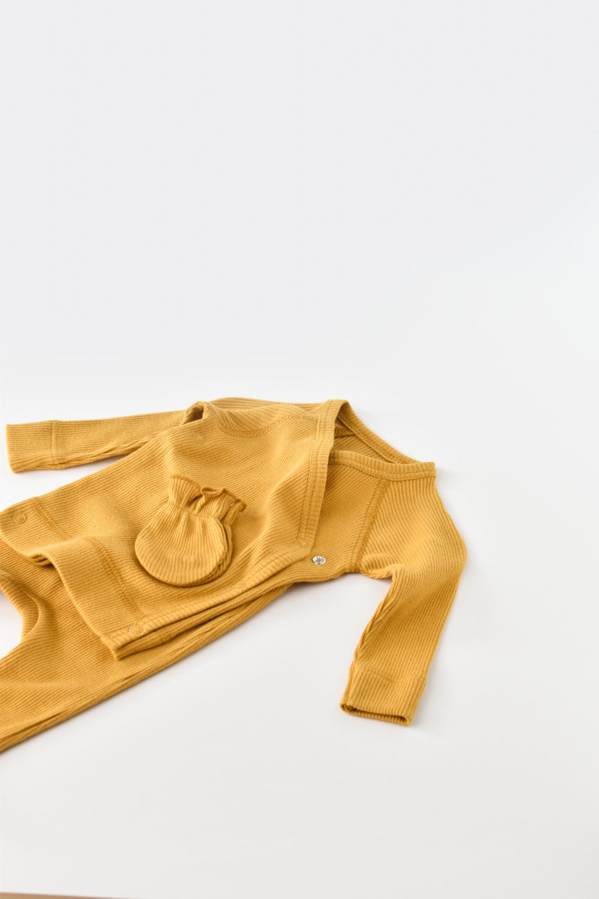 Set 4 piese: bluza, pantaloni, caciulita si manusi din bumbac organic si modal - Mustar, BabyCosy