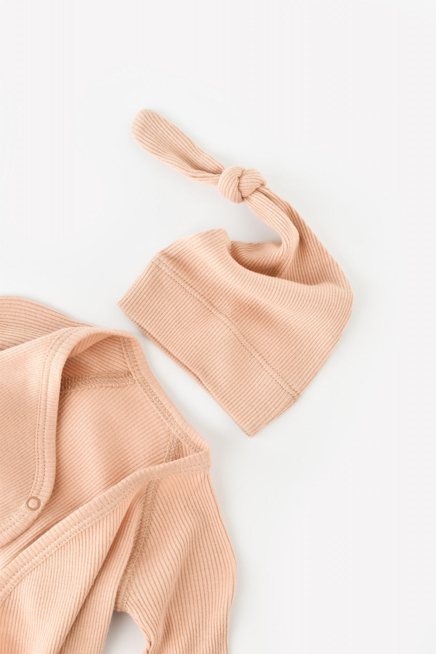 Set 4 piese: bluza, pantaloni, caciulita si manusi din bumbac organic si modal - Somon, BabyCosy