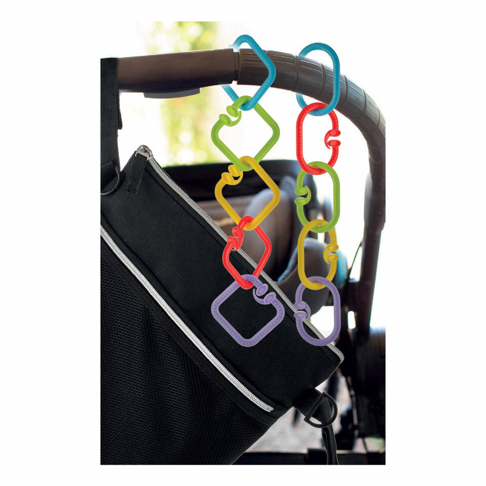 Inelele sunt ideale atat ca si jucarii pentru dentitie,cat si pentru a agata jucariile aproape oriunde! Caracteristici : - Sunt create special pentru manutele mici ale bebelusilor,acestea putand fi usor de apucat si manevrat. - Fiecare inel este viu colorat si are diferite texturi pe suprafata sa. - Ideale pentru stimularea vizuala si tactila a bebelusului. - Inelele pot fi utilizate,de asemenea,pentru a agata jucariile de carucior,scoica,salteluat de joaca,etc. - Material non-toxic si non-alergic. Fara BPA - Cu siguranta impotriva desfacerii accidentale. Dimensiuni: 7X28cm Varsta recomandata : 3 luni +